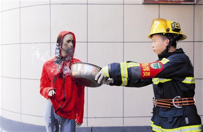 很快,明火被扑灭,但模特的身上已经覆盖了厚厚一层黄色干粉,用力拉一下被火烧过衣服,干粉随风飘散。“绝对不能使用灭火器灭火,灭火器喷出的干粉会吸附在身体表面,使得烫伤的表皮很难进行创面清理,导致身体大面积感染。”张杰说。