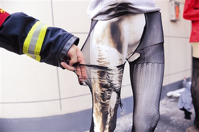 “覆盖灭火时切忌用力拉扯,那样容易造成二次伤害。”张杰说,丝袜燃烧主要是浅表皮的烫伤,但身体上粘连的燃烧残留物,因温度较高容易使烫伤加重,需立即将残留物清理,而此时表皮因烫伤会形成很多水泡,用力拉扯后往往会使得伤情加重。