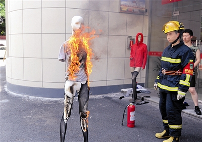随后,张杰重新将模特身上的衣物点燃,待火势猛烈燃烧后,用灭火器对着明火进行灭火。