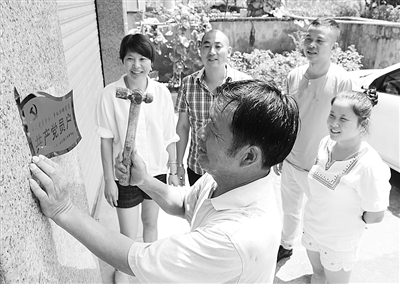 图为旧县街道合岭村的党员在家门口张贴统一制作的共产党员户牌。