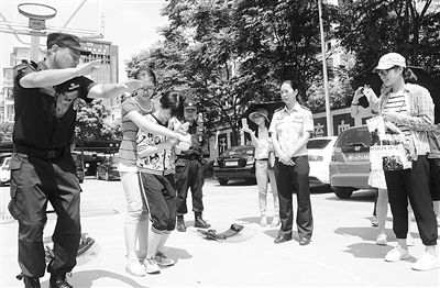 7月19日上午,海盐县元济中学的30多名高中生走进武原派出所,零距离接触警用装备,了解警营生活,体验民警的酸甜苦辣。同时,现场观摩特勤队员训练,并学习防身术。