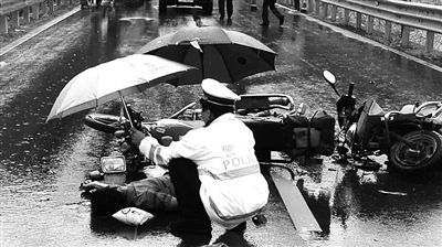 由于摩托车驾驶员伤情严重,当时又正好下着大雨。为防止伤者伤口感染,协警王璐迅速向群众借来两把雨伞,蹲伏在伤者身旁为其撑伞,直到120急救车赶到。王璐雨中撑伞的行为被路人用手机记录了下来后,迅速在微信朋友圈内被转发、点赞。