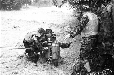 7月19日,湖北恩施市突遭暴雨袭击,崔家坝镇斑竹园村因山洪暴发,村旁的318国道成了湍急的河流,20多名群众被围困家中。该市人武部组织民兵应急队员20多人携带冲锋舟等救灾装备赶去救援。应急队员借助临时架设的绳索,趟过洪水,将4名险情最严重处的群众转移到安全点。