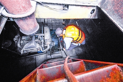“嘉海保洁1号”航行至征宇混凝土制品有限公司码头,这里停泊着数艘货运船。两位师傅开始整理接收管道,缓缓靠近一艘货运船。船主与两位师傅已经很熟了,简单寒暄后,张汉毛师傅纵身一跃,轻松登上货运船,然后来到机舱位置,顺着狭小机舱扶梯爬下去,找到废油池,开始回收工作。机舱内,隆隆的机器声震耳,浓重的机油气味更是把人熏得喉咙发紧,夏季的高温加上机器的热度,机舱堪比桑拿房。20多分钟后,张师傅完成工作爬出机舱,浑身湿透。