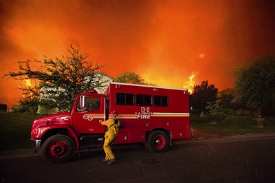 7月23日,在美国加利福尼亚州圣克拉丽塔附近,一名消防员在火灾地点附近工作。