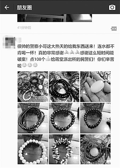 见到浑身被汗浸透的民警专程给自己送回失物,李女士惊呆了,一时语塞。事后,李女士便发了这样一条朋友圈来表达对民警的感谢:“很帅的警察小哥,这大热天的给我东西送来!连水都不肯喝一杯!真的非常感谢!感谢这么短时间能破案!点108个赞给蒋堂派出所的民警们!你们辛苦啦!”