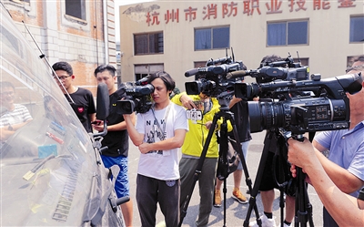上午10时许,实验正式开始。此时杭州气象显示的实时室外温度为35℃,记者用红外线测温仪实测地表温度为43℃,而实验用消防车内的温度已经高达61℃。
