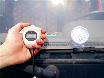 消防员在仪表盘的同样位置放上3只打火机,关闭车门后按下秒表计时。