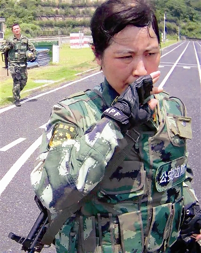 | 记者(右一)握枪站在烈日下,感觉快晕倒了 |