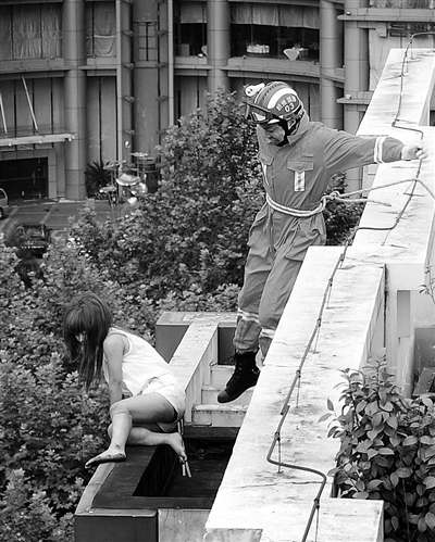 时隔10天后,杭州一中学教学楼楼顶,另一名女子欲跳楼轻生。孙中文带领消防官兵赶到现场后,慢慢靠近轻生女子,查清周围的环境后,他将安全绳系在自己身上,猛地翻出20米高的楼顶,趁女子低头的一刹那,用右手将女子牢牢抱住,将她成功救下楼顶。