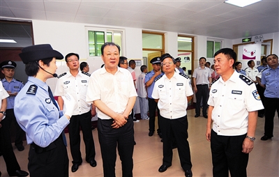 昨天下午,司法部副部长刘志强(右三)来到省拱宸强制隔离戒毒所,检查指导司法行政戒毒场所夏季安全工作,调研我省“四四五”戒毒模式运行情况。
