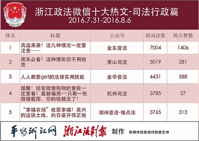 热文榜,“普法”是主线。“金东普法”的《高温来袭!这几种情况一定要注意……》获得第一名。“萧山司法”的《房东必看!这种情形你不用担责》获得第二名。“金华普法”的《人人都要get的法律实用技能》获得第三名。