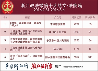 热文榜,“老赖”依旧是主线。“宁波慈溪法院”的《8月第一波“老赖”来袭,最高欠188万!》获第一名。“嵊州市人民法院”本期发力,其《【曝光台】嵊州市人民法院失信被执行企业通报》获得第二名。