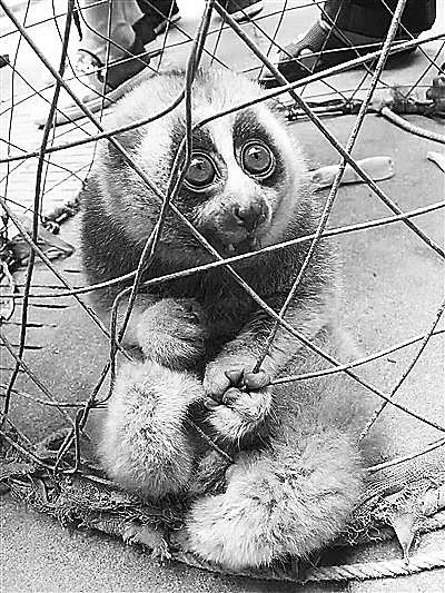 “这是我工作以来,第一次碰到懒猴。”胡冬旭说这是只成年猴,身长30厘米左右。