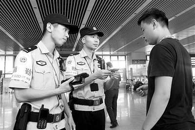 台州市火车站派出所严格落实人、证、票“三合一”查验工作,并对重点车次实行二次安检,确保铁路运输和旅客安全。图为昨日,民警在候车大厅开展查验。