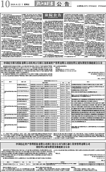 中国民生银行股份有限公司杭州分行浙江省浙商资产管理有限公司债权转让通知暨债务催收联合公告