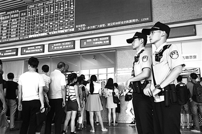 台州市火车站派出所和黄岩公安分局全力加强对台州火车站的安保工作,确保暑期旅客安全、顺利出行。图为昨日,民警在售票大厅执勤。
