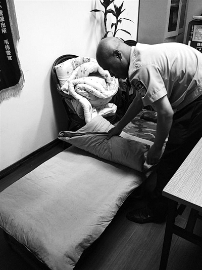 | 同事偷偷拍下毛伟在警务室铺被子的照片 |