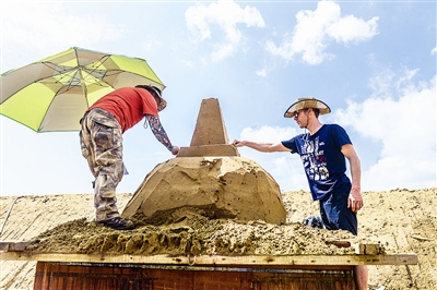 昨日,“沙绘G20”舟山国际沙雕展在舟山朱家尖南沙景区正式开雕,20多名中外沙雕手共同用沙雕打造中国、俄罗斯、美国、德国、印度尼西亚等20国的特色景观和城市风貌,为即将在杭州举行的G20峰会增添气氛。图为荷兰沙雕手尤红(右)与中国沙雕手一起进行沙雕创作。