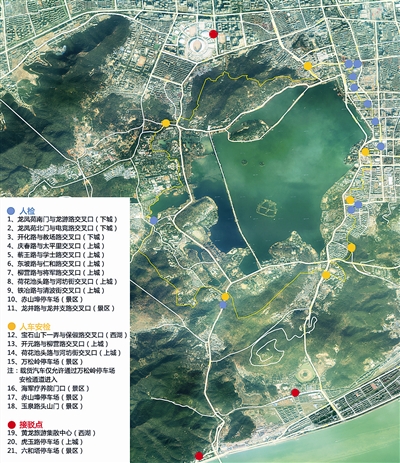 西湖封闭管理区在设置安检站过程中,充分考虑了生活、工作在封闭管理区的人员出行、生活需要,为将影响降低到最低程度,公安机关在人口稠密区和商业繁华区相应增加了安检站的数量。封闭管理区外围共设立11个人检安检站和7个人检车检合一的安检站(如下图)。