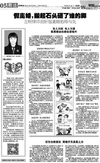 类似的案子并不鲜见,有关假离婚的是是非非也众说纷纭。本周二晚上7:30,本报微信公众号(zjfzbs)主办的“法治微沙龙”特别邀请浙江剑正律师事务所合伙人、副主任,杭州市婚姻家庭纠纷人民调解委员会特邀人民调解员杨红律师,围绕假离婚的是与非,上了一堂“微课”。本期《看法》栏目将“微课”内容整理刊出,方便大家阅读。