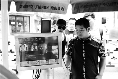 离人员安检口约三四十米的距离,民警对每一位进入景区封闭管理区人员的身份信息进行核查,绝大多数人都排队并主动出示身份证,配合民警工作。身份证核查过后是随身物品的过机安检。如果是封闭管理区内人员,则可刷身份证免检通过,全程有志愿者引导。