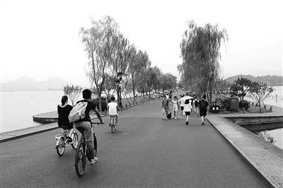 “95后”小王姑娘来自广西,记者8月21日上午11时在西湖景区封闭管理区遇到小王和她的两个小姐妹时,三人刚从北山路一家私人自行车租赁店租了三辆自行车,准备骑车环游西湖。