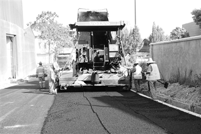 在施工现场,工作人员将沥青铺设在路面上,再由机械进行压实。尽管天气炎热,地表温度高达100多摄氏度,但工作人员依然在自己的岗位上坚守。