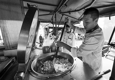本报讯 载着边防总队农场提供的新鲜蔬菜,野战炊事车和炊事挂车开进了战营,为官兵们提供日常食品。昨天,本报记者走进了浙江边防后勤基地,体验了一把现代化后勤应急保障体系。炊事员们通过高效运作的设备,不到两小时就完成了100人份的烹饪餐。