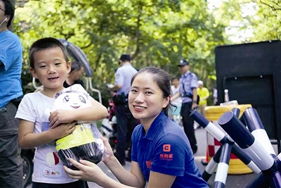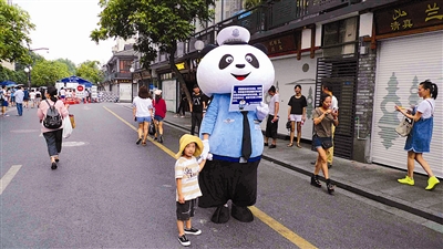 本报讯 “您好!请您在这里排队,工作人员将尽快安检。烈日下请注意防晒,感谢您对杭州公安工作的支持!”连日来,在杭州西湖景区封闭管理区外围的安检站,一只憨态可掬的“熊猫警察”耐心地引导市民游客过安检,萌萌的样子引得不少人争相合影。