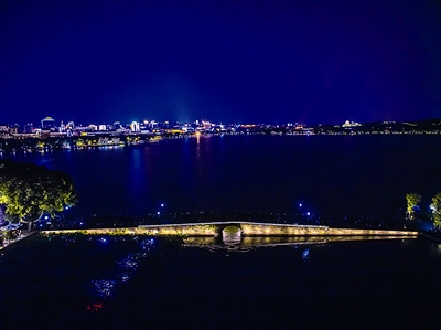 8月25日是G20杭州峰会倒计时10天。西湖在夜色中水光潋滟、山色空蒙。这幅航拍照片,从空中的视角,拍摄了杭州西湖断桥夜景。
