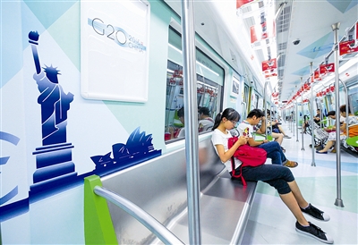 1号线专列车厢则采用蓝色调,以水墨效果展示杭州的风景名胜,以剪影手法展现G20成员国元素,体现了东西方文化的交流与碰撞。