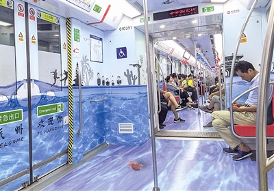 昨天上午,登上杭州地铁4号线的小许,一上车就发现色彩变了。车厢内,以淡绿色调为主,流畅的线条营造出投影的感觉,在车厢两侧展示G20成员国风情与杭州元素。