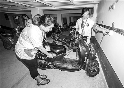“新《浙江省消防条例》施行,电动车乱停乱充电可罚200元!”昨天下午3点多,王欣他们分头行动,把街道里新发下来的“消防提醒”贴进楼道,同时对每幢居民楼进行检查。在白泽弄7幢,网格员陆佳红发现一个接线板拖着长长的电线从7楼挂下来,一辆电动车正在充电。