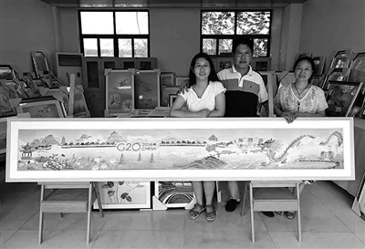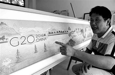 丝绸画缋是一种融合染、绘、绣、泥金银等多种工艺手段的传统技艺,在2016年初被列入杭州市非物质文化遗产名录。浙江杭州的叶建明是丝绸画缋第四代传承人。为了迎接即将举行的G20杭州峰会,叶建明和妻子、女儿一家三口合作,女儿叶沣仪设计、叶建明制作、妻子协助,历时半年完成了一幅名为《迎接G20 龙喜迎客》的丝绸画缋作品。这幅作品长308厘米,宽56厘米,以真丝作底布,上面绘有西湖十景、钱江涌潮等景观,再配以五爪金龙、七彩祥云、如意锦鲤等元素。