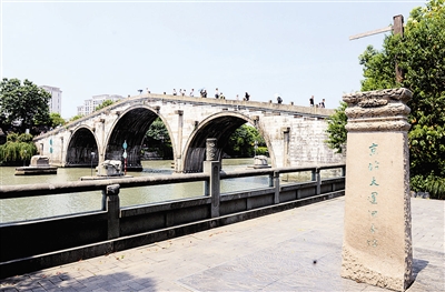 著名桥梁专家茅以升说过,“一个民族有了文化就有桥,桥是文化的表征”。拱宸桥,这座标志性的三孔石桥立在运河的水面上,据说已有380多年的历史。古桥在几经修整后依然是行人来来往往。夏夜,杭州人坐在桥上乘凉,俯瞰灯光运河,别有一番韵味。