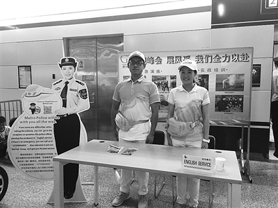为助力峰会安保,杭州地铁公安分局还从前期“轻松学英语、助力峰会行”系列英语活动中,挑选出30余名口语流利、有较强涉外沟通和协调能力的民(辅)警(其中7人具有英语专业八级水平),组建成英语服务队。8月22日起,浙江理工大学的9名语言志愿者也加入服务队,协助站点民(辅)警开展涉外服务,提供语言支持。王妍伃和张虞就在其中。