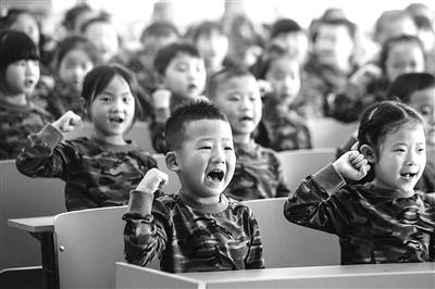9月7日,幼儿园的孩子们在“娃娃军校”开班仪式上宣读誓词“我是小小兵,不怕困难我能行”。