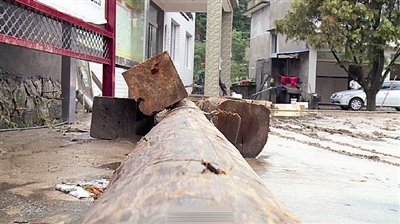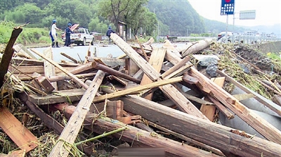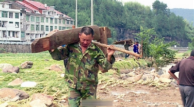 16日,泰顺部分道路抢修刚完成,季海波和同事就赶到了现场,勘察情况,寻找被冲走的木构件,着手准备抢修工作。