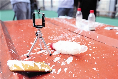 再看现场,爆炸后的塑料瓶底部开了一个很大的口子,瓶内的物体已全部飞溅出来,整个实验台上到处都是白色的石灰。
