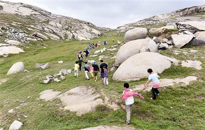 10月5日至7日,由福建省登山协会组织的青少年海岛露营活动来到福建塘屿岛,31位小朋友在5位专业户外教练的带领下,体验了海滩露营、划橡皮艇、捡贝壳等活动。图为10月6日,小朋友在塘屿岛进行海岸健行活动。