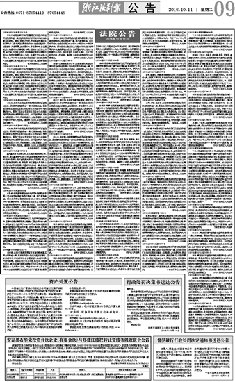 陆加中:本院在审理原告熊以三、张自祥诉被告陆加中、安徽华力建设集团有限公司建设工程合同纠纷一案中,原告熊以三、张自祥于2016年8月26日向本院提出撤回对被告陆加中起诉的申请。因你下落不明,采用其他方式无法送达,依照《中华人民共和国民事诉讼法》第九十二条的规定,向你公告送达本院(2016)浙0110民初4263号民事裁定书,裁定如下:一、准许原告熊以三、张自祥撤回对被告陆加中的起诉。二、原告熊以三、张自祥诉被告安徽华力建设集团有限公司建设工程合同纠纷一案继续审理。自本公告发出之日起,经过十日,即视为送达。杭州市余杭区人民法院