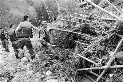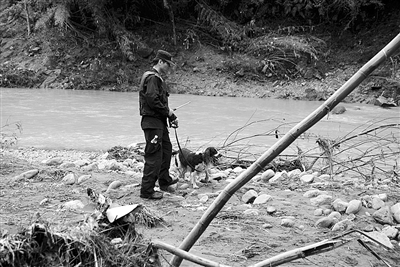 搜救队员与警犬相互配合,沿着河岸两边由上往下搜索,当警犬在一处疑似地点徘徊时,搜救队拿着柴刀斩断覆盖在上面的毛竹、杂草,接着用锄头、铲子小心刨开洪水带来的泥土,可惜一直挖到岸边,也未有所收获。