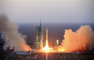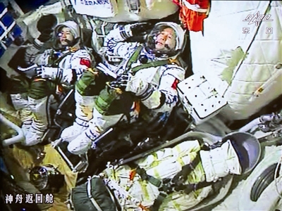 10月17日7时30分,搭载着神舟十一号载人飞船的长征二号F遥十一运载火箭在酒泉卫星发射中心点火升空。两名航天员景海鹏(右)和陈冬在火箭发射瞬间敬军礼(摄于北京航天指挥控制中心指挥控制大厅大屏幕)。