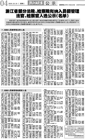浙江省部分法院、检察院拟纳入员额管理 法官、检察官人选公示(名单)