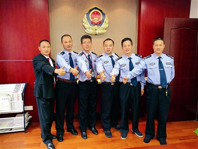 | 老战友们为陈冬点赞 左起:赵士明、苏永生(如今在公安局工作)、许宏林、任捍东、吴一中、姚金通 |