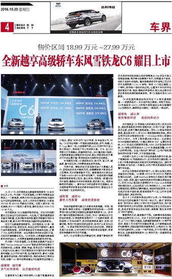 10月17日,东风雪铁龙全新越享高级轿车C6在北京正式上市。作为新一代法系旗舰,C6将引领雪铁龙品牌进入一个新高度,更将为用户创造全新的极致优越的全方位舒适驾乘体验。此次上市的东风雪铁龙C6配备350THP和380THP两款动力系统,匹配6速手自一体变速箱,共计4个级别,5款车型,售价区间为18.99万元~27.99万元。