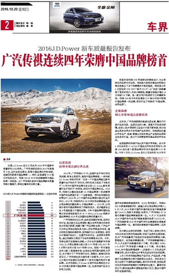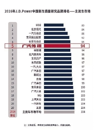 2013年,广汽传祺以97分,远超行业平均分的优异成绩,跻身合资前列,高居中国品牌榜首,一举冲破 J.D. Power报告历年来“没有一个中国品牌超过新车质量行业平均水平”的状况,同时也有力回击了专家关于“10年内中国汽车品牌无法达到J.D. Power新车质量行业平均水平”的预言,成功为中国品牌正名。2014年,传祺又以整体排名第14、中国品牌第一的成绩将中国汽车品质提升至一个全新高度,同时在传祺效应的带动下,2014年,6个中国汽车品牌得分超过行业平均分。2015年,传祺再次以96分的优异成绩超越众多合资品牌名列整体第8,中国品牌第一。2016年,以传祺为首的中国品牌保持了持续的进步,进步幅度在过去6年里显著大于国际品牌。今年中国品牌和国际品牌之间的表现差距仅为14个PPM,J.D.Power预测中国品牌将在2018年达到国际品牌的质量水平。