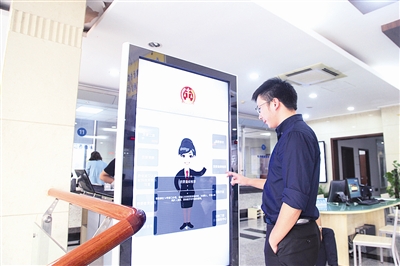 刘先生在取号机中取了号,是15号。等候时,他又看到了墙上另一块触摸屏,他走过去轻轻点击,看到了“窗口简介”“诉讼指南”等栏目。