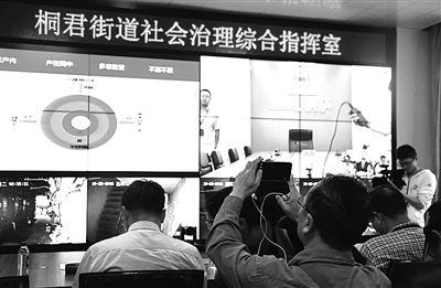 采访团在桐君街道的社会治理综合指挥室,就见到了这样一个分平台。这个分平台不仅连着县级平台,还就全街道89个网格的分布制作了一张图,融合了街道700多个视频监控信息和所有网格信息。